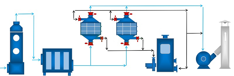 (2)完成解吸脫附以后活性炭吸附器Ⅰ進(jìn)入待用狀態(tài),待活性炭吸附器Ⅱ接近飽和時(shí),系統(tǒng)再自動(dòng)切換回來,同時(shí)對(duì)活性炭吸附器 Ⅱ進(jìn)行解吸脫附,如此循環(huán)工作。
